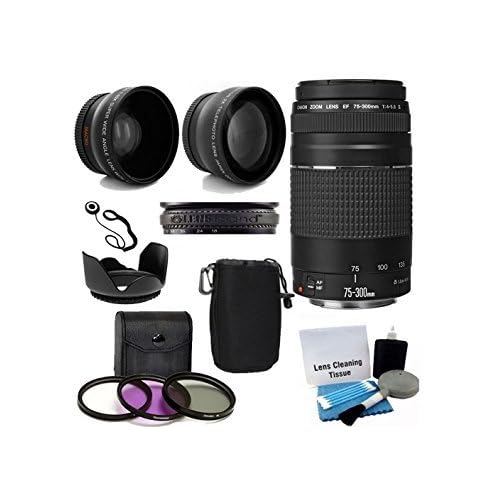 Canon EF 75-300mm f/4-5.6 III Telephoto Zoom Lens with 2X Telephoto Lens, HD Wide Angle Lens and Accessories (8 Piece Kit)