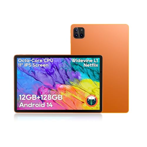 Android Tablets, 11 inch Octa-Core Processor Tablet with 2 Years Protection, 128GB Storage,12GB RAM, 6ft Charging Cable, 8000mAh Battery, Reinforced Type-C Port, Quad-Speaker, Orange