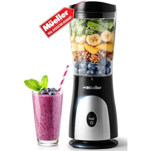 Mueller Smoothie Blender for Smoothies – Personal Blender for Shakes, Frozen Drinks, Baby Food & More, 15oz Travel Cup and Lid, Durable Stainless Steel Blades for Powerful Blending Performance, Black