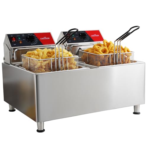 CROSSON ETL Listed 30Lbs Dual Tank Electric Commercial Deep Fryer with Solid Basket,Lid and Height Adjustable Legs for Restaurant Use,8L×2 Commercial Countertop Deep Fryer-120V/3600W(30Amps)