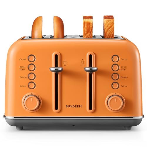 BUYDEEM DT640 4-Slice Toaster, Extra Wide Slots, Retro Stainless Steel with High Lift Lever, Bagel and Muffin Function, Removal Crumb Tray, 7-Shade Settings,Orange