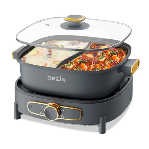 Dezin Hot Pot Electric with Divider, 4L Electric Shabu Shabu with Dual-Flavor Pot,3.7″ Depth Nonstick Dual Side with Multi-Power Control for Party, Family and Friend Gathering