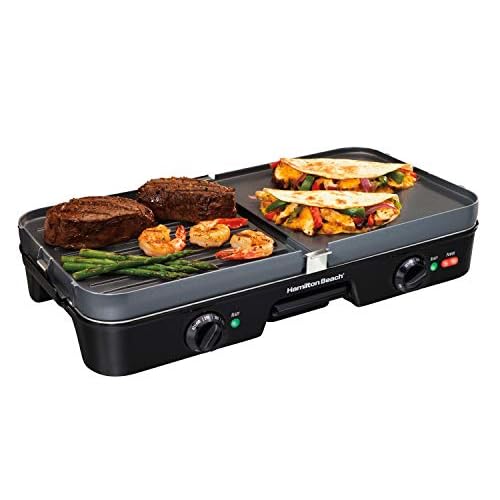Hamilton Beach 3-in-1 Electric Indoor Grill + Griddle, 8-Serving, Reversible Nonstick Plates, 2 Cooking Zones with Adjustable Temperature (38546), Black