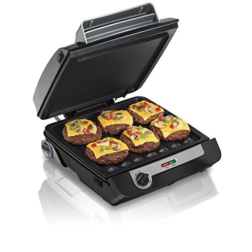 Hamilton Beach Electric Indoor Grill, 6-Serving, Large 90 sq. in. Nonstick Easy Clean Plates, Floating Hinge for Thicker Foods, 1200 Watts, 6.38″D x 12.68″W x 13.78″H , Silver (25371)