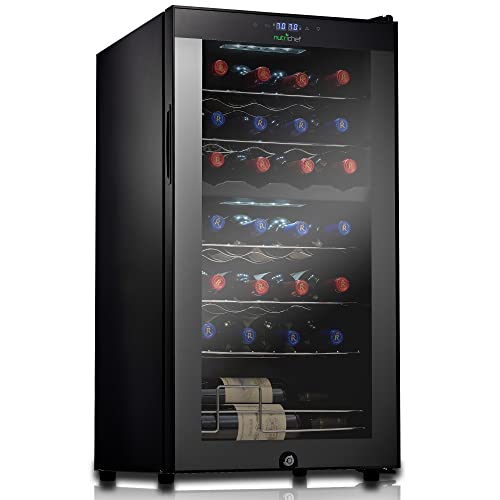 Nutrichef 28 Bottle Wine Fridge Adjustable Temperature 41°F to 64°F Single Zone Red & White Chiller Ultra Quiet Operation Wine Cooler For Home & Office, Free Standing 33x16x17 IN, Black