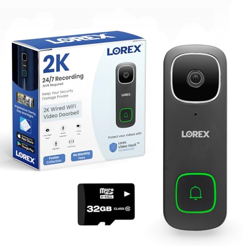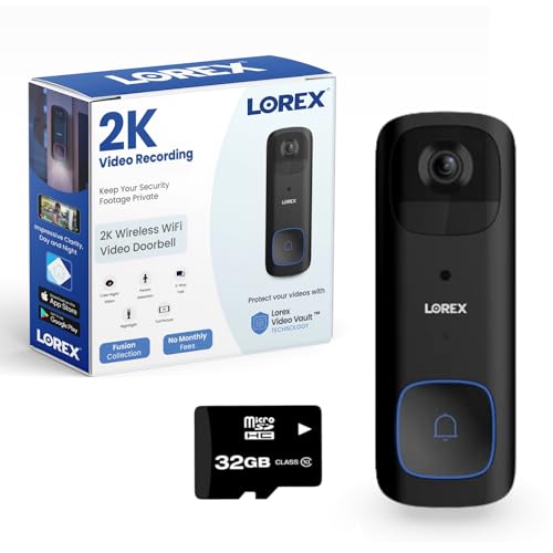 Lorex 2K Wi-Fi Smart Video Doorbell Security Camera, Black – Includes 32 GB Micro SD, No Subscription Fee – Smart Security Lighting, Night Vision, Motion Detection, Battery Powered, IP65 Weatherproof