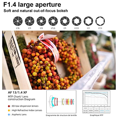 【Large Aperture High-resolution】The f/1.4 maximum aperture allows the lens to shoot at a higher shutter speed and lower sensitivity in low light environments, helping users focus on creative shooting without fear of low light.This lens is autofocus with manual focus override. The aperture is also manually adjustable with a clickable aperture ring based on the lens body, from F/1.4 to F/16 in 1/3 stops with A mode.