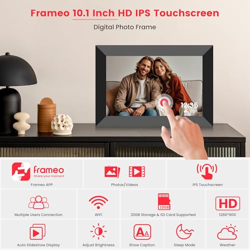 Frameo 10.1 Inch WiFi Digital Picture Frame, Smart Cloud Electronic Photo Frame with HD IPS Touch Screen Slideshow 32GB Memory Auto-Rotate Wall Mount, Share Photos/Videos from Phone by Frameo App