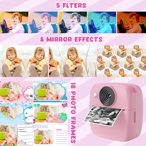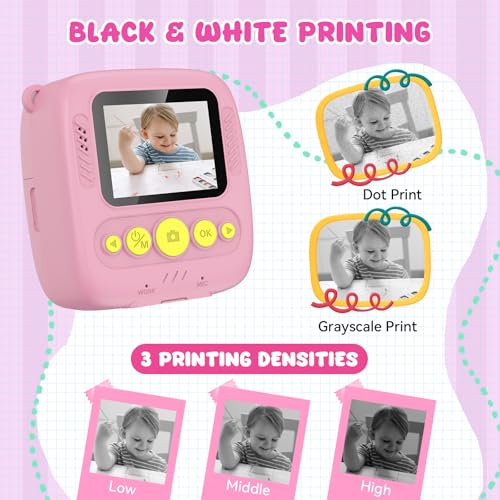 【Funny Instant Print Camera 】The kids digital camera has been upgraded with an instant printing function.It can not only print black and white photos but also choose from 3 different printing density levels and 2 printing modes of toddler cameras.Our instant camera comes with 17 stickers and frames, as well as 5 filters, allowing you to take fun and cute photos as souvenirs.