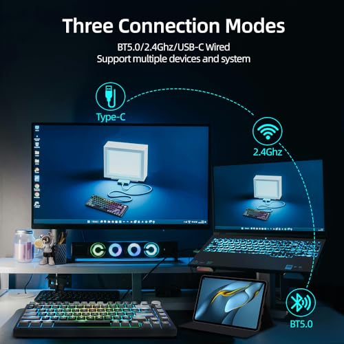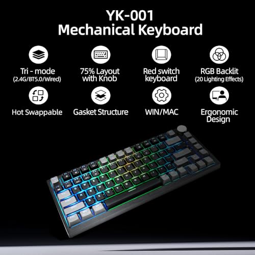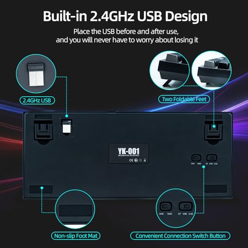 Tri-Mode YK001 Mechanical Keyboard: YK001 wireless mechanical keyboard offers seamless connectivity with BT 5.0, 2.4GHz wireless, and USB C wired options, ensuring compatibility with a variety of devices. Designed for versatility, YK001 keyboard mechanical is compatible with PC, laptops, tablets, smartphones, PS, XBOX, and more, making it the perfect keyboard for gaming, work, or everyday use. Whether you’re at home, in the office, or on the go, YK001 gaming keyboard meets all your typing and gaming needs with style and performance.