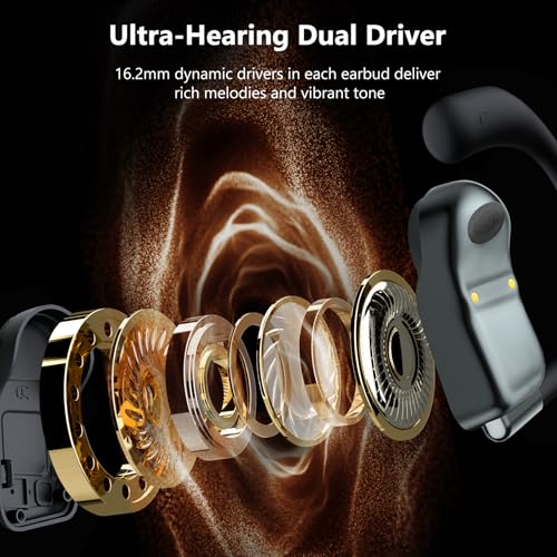 Immersive Sound & Clear Call: 16.2mm large dynamic driver earbuds wireless Bluetooth deliver powerful bass, clear mids, and bright highs that bring every note and detail to life, giving you high-fidelity sound reproduction. Whether you are listening to music or making a voice call using over ear headphones, you will enjoy crystal-clear audio. The built-in microphones of open ear buds offer crystal-clear and accurate voice transmission so you can enjoy an unobstructed call experience.