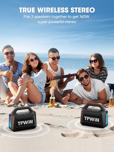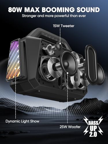【80W Max Booming Sound】The wireless bluetooth speaker, engineered with dual 25 W(peak) subwoofers and dual 15 W(peak) tweeters delivers powerful sound in a portable, waterproof design. Portable speaker gives you the best listening experience anywhere! Like jobsite, camping, beach, roadtrips