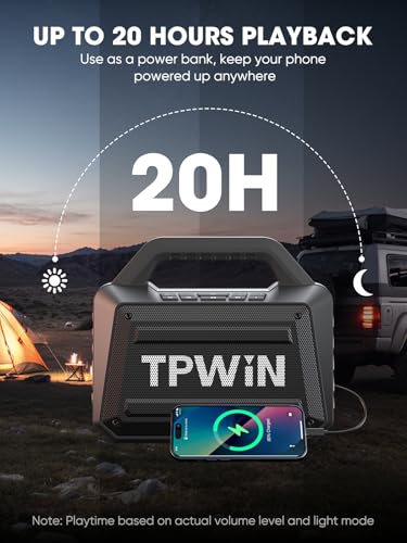 【20H Playtime & Power Bank】TPWIN wireless speaker equipped with high-capacity battery, without frequent recharging and meets your music playback needs for a whole day. You can use this wireless speakers with bluetooth as power bank, keep your phone powered up wherever you are. (Playtime based on actual volume level and light mode.)