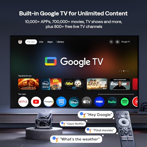 Official Unlimited Streaming, Massive Entertainment: BOOM mini smart projector brings built-in Google TV to your big screen, unlocking 10,000+ apps, including NetfIix, YouTube, and the hard-to-find, officially licensed Disney+ and Hulu. No extra streaming stick needed. With 2GB RAM + 16GB storage, enjoy smooth, uninterrupted entertainment—just plug in, power up, and start watching.