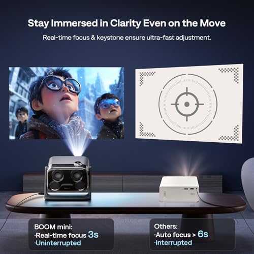 Always in Focus, Ready in 3 Seconds: Powered by advanced ToF technology, BOOM mini movie projector delivers real-time auto focus and keystone correction in just 3 seconds—far faster than others in its class. Even if moved or bumped, it instantly readjusts, keeping visuals sharp and your experience uninterrupted. Ensure an immersive viewing experience.