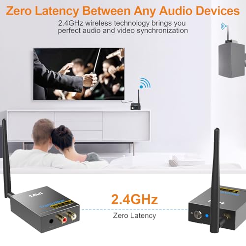 1Mii 2.4Ghz Wireless Audio Transmitter Receiver for TV, 320ft Long Range 20ms Low Delay 192kHz/24bit HiFi Audio, Wireless Adapter Kit for Subwoofer/Powered Speaker/Stereo/Soundbar, RCA(3.5mm)Out/input