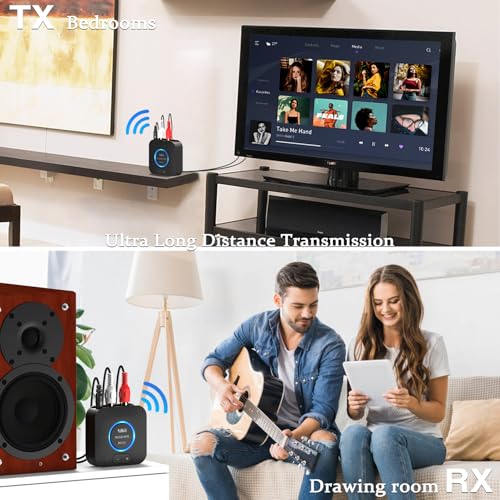 【260ft Low Latency Syncronization】Designed with anti-interference technology, the transmission distance can reach up to 260ft(80m, no obstacle) and minimum 98ft(30m) for indoor use, enjoy lower than 25ms lantency low noise audio. Please NOTE that the transmitter and receiver can only be connected to each other, cannot be paired with other bluetooth devices. Make the transmitter/ receiver powered with our included power adapter is suggested.