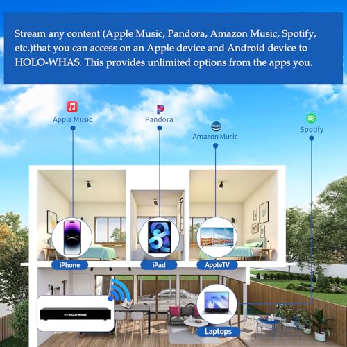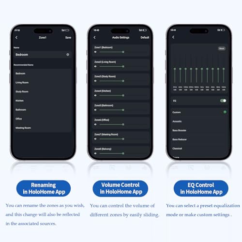 Easy Network Setup: Allowing users to easily set up the HOLO-WHAS network through a mobile app. The setup is guided, making it simple and user-friendly. Multi-Zone Support: Supports up to 8 independent audio zones simultaneously. Allows playing different audio content in different rooms or areas, suitable for homes, commercial spaces, or conference rooms.