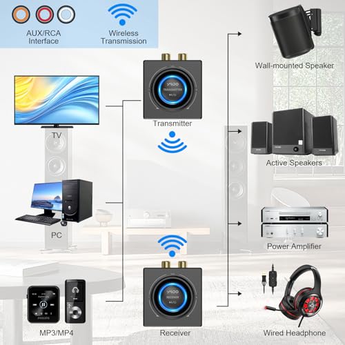 [Stable Connection] Equipped with the 2.4GHz, our wireless audio adapter connection is quicker and more stable. After connected to power, the transmitter and receiver will automatically power on and enter paring mode and there is a blue ring light to indicate its working state, hands free for audio entertainment. No more disturbing disconnection and manual re-connection.