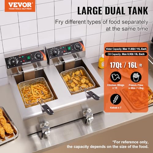 VEVOR Commercial Deep Fryer, Dual Tank 3000W Electric Countertop Fryer with Basket, 2 x 11.6Qt/11L Double Stainless Steel Oil Fryer with Drain, Time & Temp Control, for Kitchen Restaurant Use