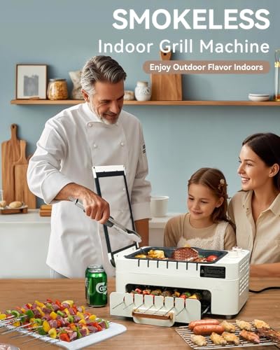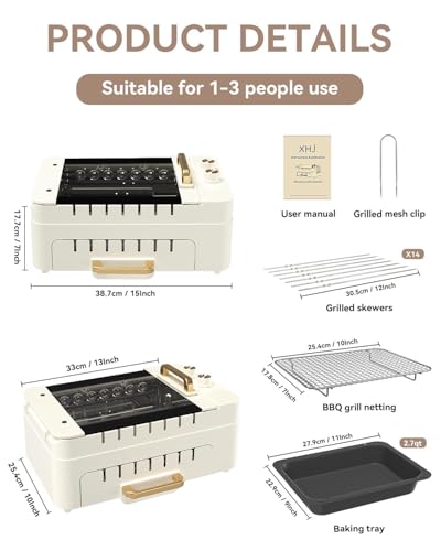【3-In-1 Smokeless Indoor Grilling Machine】The versatile tabletop grill machine design with removable function that allows you to easily switch between the grill pan, rotating skewers and grill grates .This versatility means you can grill, bake, and even fry a variety of foods, such as steak, lamb kebabs, hot dogs, hamburgers, shrimp, grilled fish, oysters, corn, vegetables, and more. The indoor grill with upper and lower layers for Dual Zone Cooking, this virtually smoke-free grill is perfect for indoor use.parrilla eléctrica para cocinar.