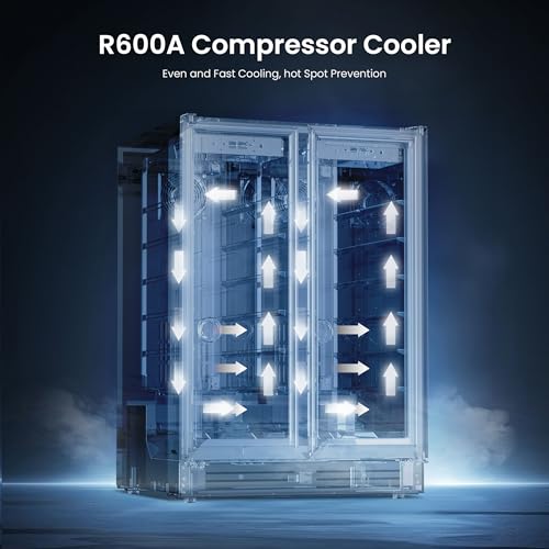 【Advanced Compressor】This compressor provides fast, even cooling, far surpassing cheaper thermoelectric models in energy efficiency. Its 360° air circulation system keeps humidity and temperature balanced, extending wine preservation. The compressor runs quietly at 41-43 dB and minimizes vibrations, preventing any impact on the wine’s aging. For optimal cooling performance, let the fridge stand upright for 24 – 36 hours before turning it on.