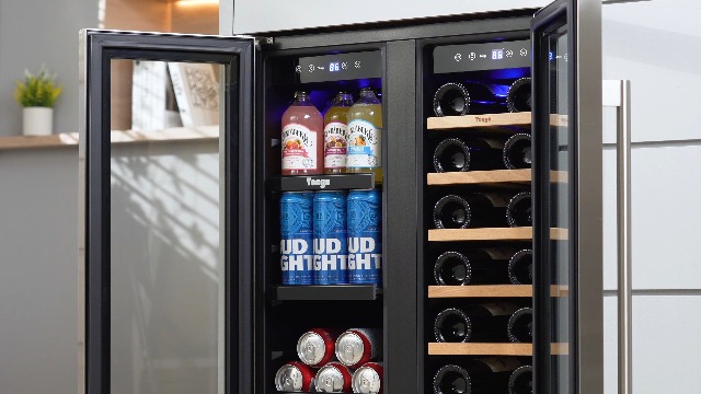 【Flexible Storage and Perfect Protection】It can hold 20 bottles of 750ml Bordeaux and 60 cans of standard 12oz cans once. The wine section features 6 wooden shelves, while the beverage section has 3 wire shelves. The wooden shelves 100% made of FSC-Certified wood,sourced from sustainable forests. These smooth shelves minimize friction and vibration. Both shelves are removable and adjustable, allowing you to customize the interior layout to fit various sizes of wine and beverage bottles.