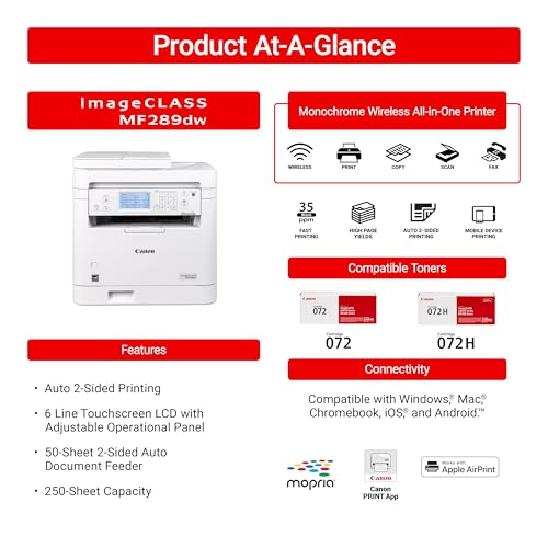 Canon imageCLASS MF289dw – Monochrome, Duplex, Wireless Laser Printer, All-in-One Print, Copy, Scan, Fax, Auto Document Feeder, 1 Year Limited Warranty, 35 PPM, White