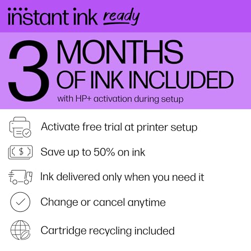 3 MONTHS OF INK WITH HP+ ACTIVATION – Subscribe to Instant Ink delivery service to get ink delivered directly to your door before you run out. After 3 months, monthly fee applies unless cancelled, and you save up to 50%.