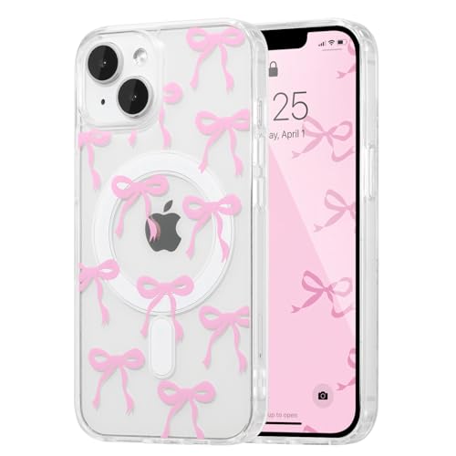 UEEBAI Magnetic iPhone 14 & 13 Case, Bow Compatible With MagSafe, Wireless Slim Clear Ribbon Phone Cover Anti-Yellowing Shockproof Protective for Women Girl – Pink