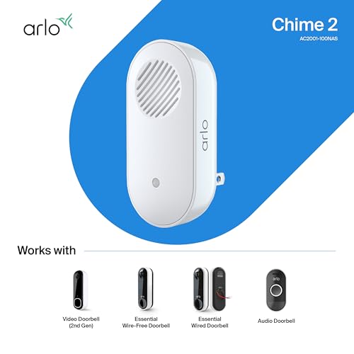 Receive instant audible alerts for a doorbell press or when motion is detected with the Arlo Chime 2. Easily plug into a wall outlet and connect directly to Wi-Fi for a wire-free install. Deter unwanted guests by triggering the built-in siren automatically or manually from the Arlo Secure App. Select from a variety of melodies to customize alerts. Works with with Arlo Essential Video Doorbell Wire-free (AVD2001), Video Doorbell Wired (AVD1001), Audio Doorbell (AAD1001), Arlo Video Doorbell HD (AVD3001), and Arlo Video Doorbell 2K (AVD4001).
