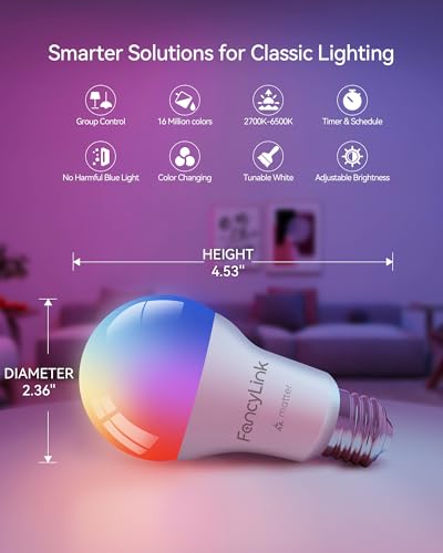 【16 Million DIY Colors】The Fancylink Matter smart light bulbs explore a palette of 16,000,000 hues and fine-tune white tones ranging from a warm 2700K to a cold 6500K. Energetic Matter Wifi light bulbs allow you to customize the ambience by adjusting the brightness from 1% to 100%