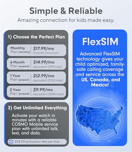 UNLIMITED TALK, TEXT, AND DATA –– Stay connected anytime, anywhere with COSMO Mobile Family-Safe service. Easily activate your watch’s pre-installed SIM card out of the box and choose from flexible and affordable cellular service plan options – starting at just $9.99/month equivalent with prepaid plans. (NOTE: JrTrack is not compatible with other carriers)